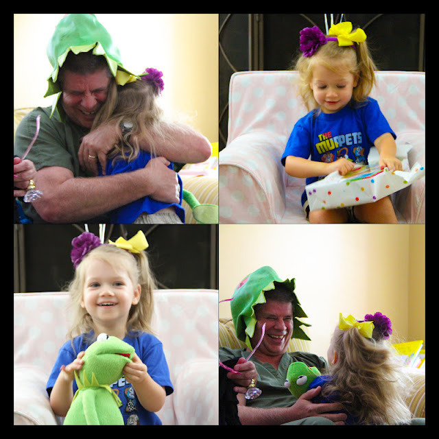We opened presents and one of her gifts was a stuffed Kermit! We asked her to love Kermit and she ran to her JimPa! So sweet!